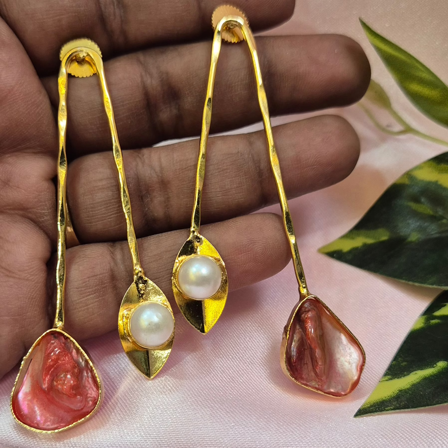 Asymmetrical Gold Drop Earrings,Crafted with a hammered gold-tone finish, each earring features a unique design: one adorned with a luminous pearl set in a golden leaf motif, and the other with a vibrant pink stone framed in gold.