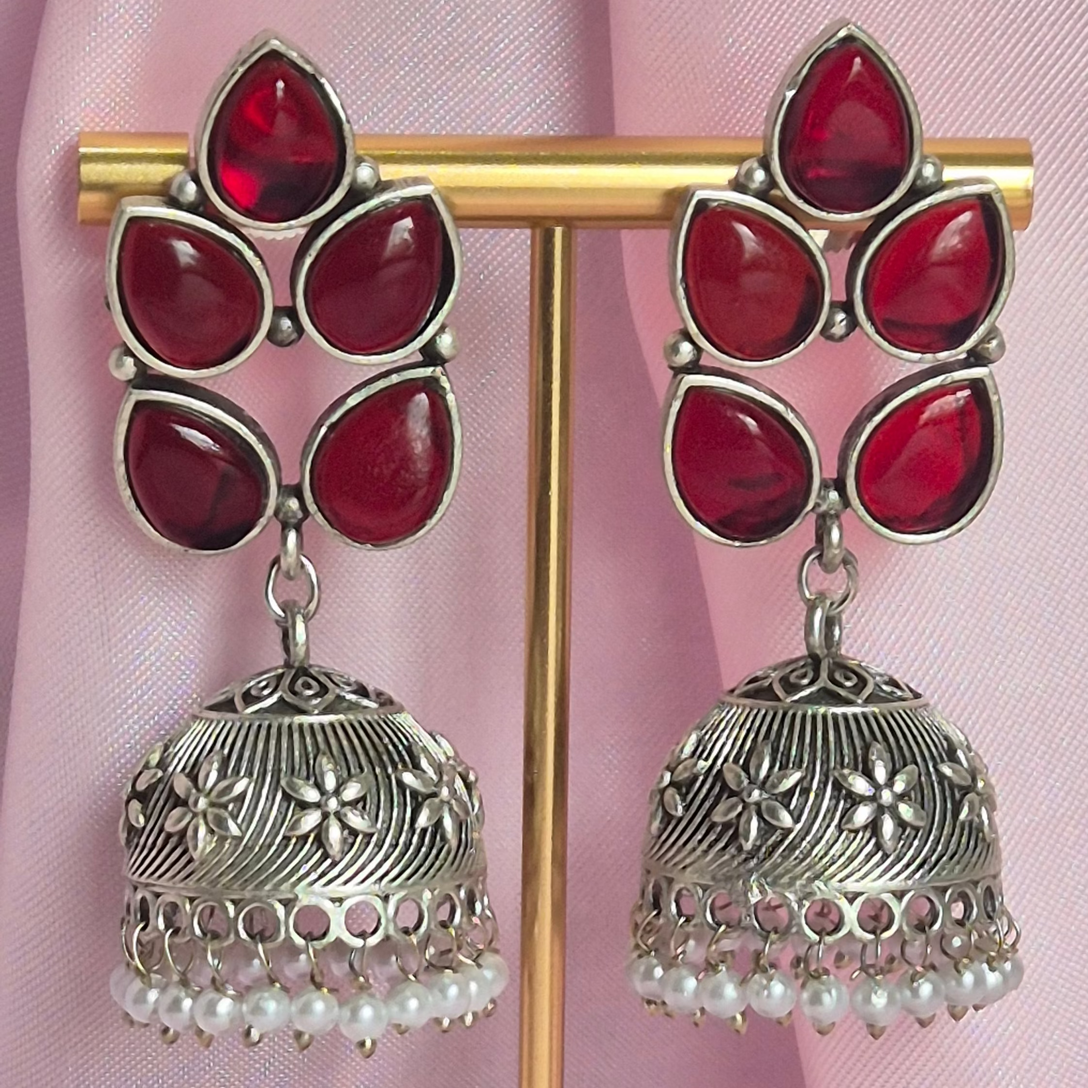 Beautiful oxidised Jhumkas with Red monlisa stones in leaf pattern.
