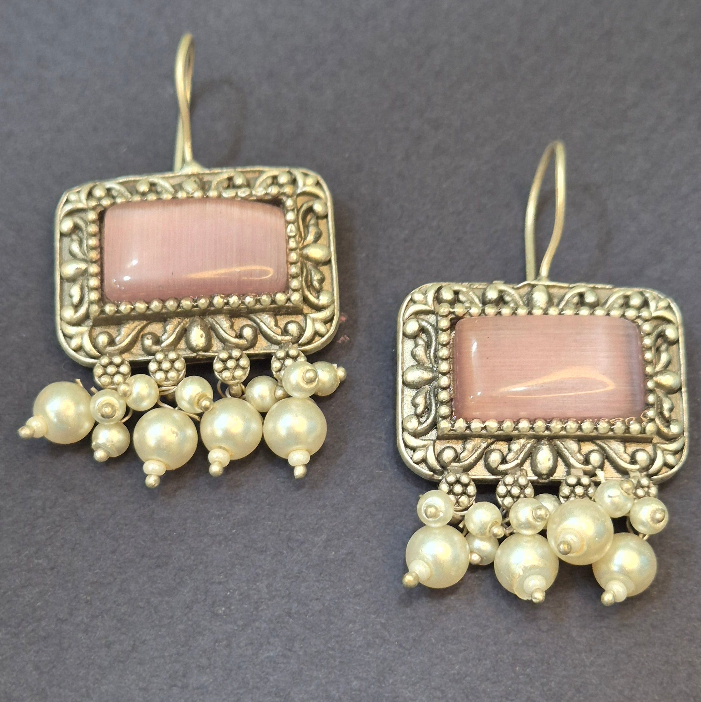 Brighten your ethnic look with these stunning oxidised silver earrings, featuring a glossy mustard-yellow/Red,Pink rectangular stone framed in intricate antique carvings. The design is beautifully finished with soft, lustrous pearl cluster danglers that add elegance and movement to every step.