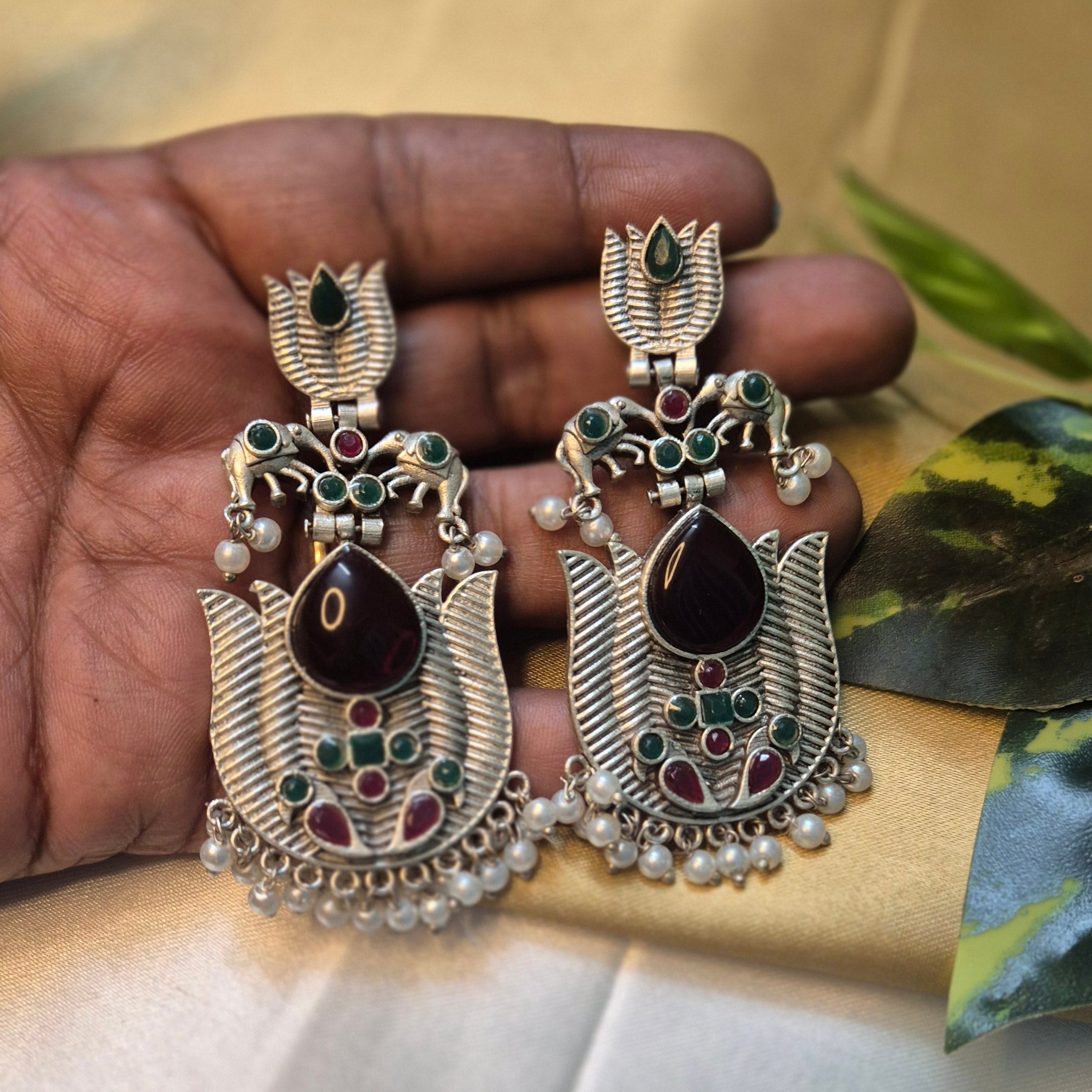 Stand out with these stunning lotus-inspired oxidised earrings, crafted with intricate detailing and rich traditional charm. Featuring a bold ruby red /yellow teardrop stone, elegant green and maroon accents, and a beautifully carved lotus-shaped frame — these earrings bring a divine temple-jewellery vibe to your festive look.
