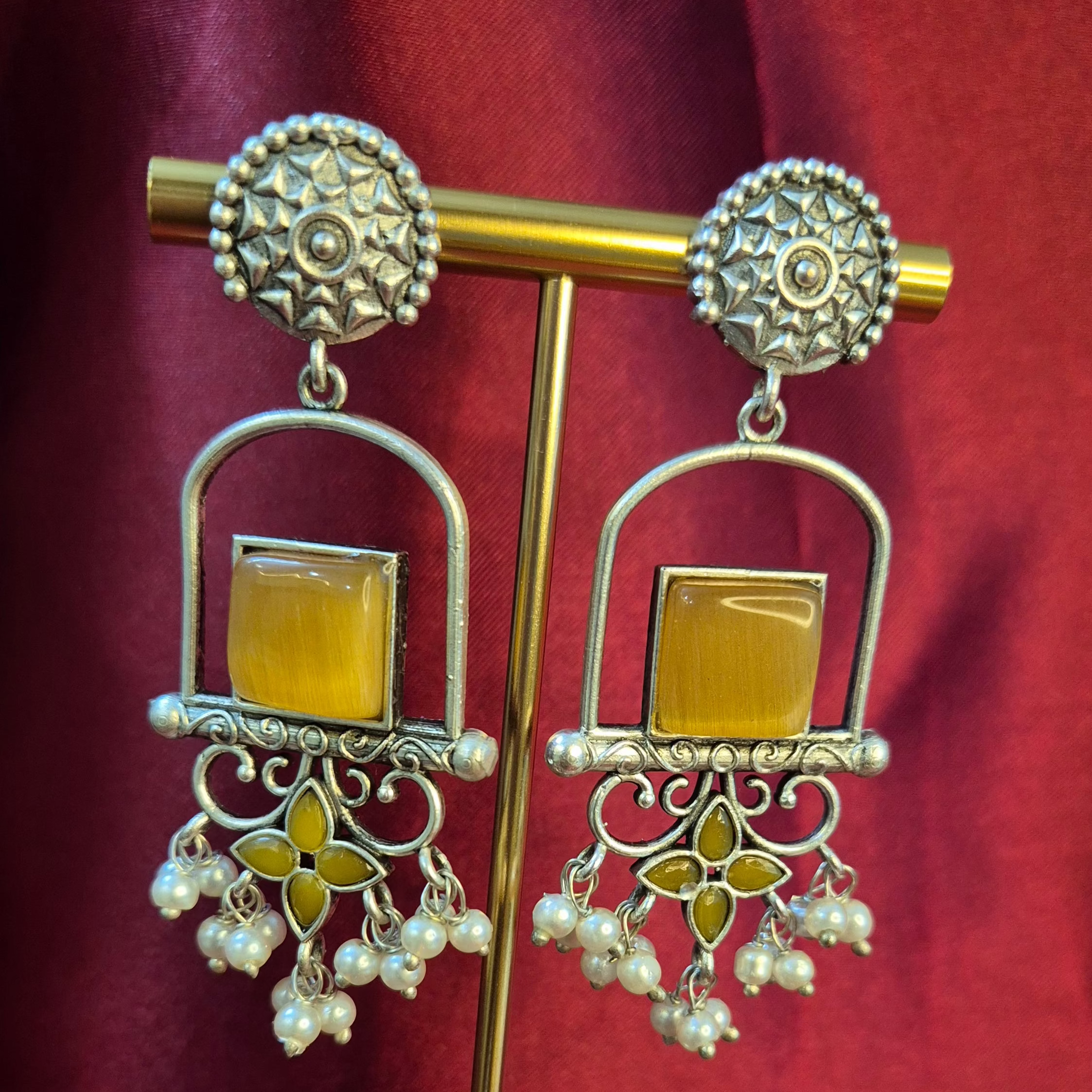 Make a striking style statement with these beautiful oxidised silver hanging earrings, featuring a bold Yellow stone framed in a unique arch-shaped design. The intricate scrollwork at the bottom is adorned with delicate green and red stones, adding a festive pop of colour. Finished with soft pearl cluster danglers, these earrings blend elegance with ethnic charm perfectly.