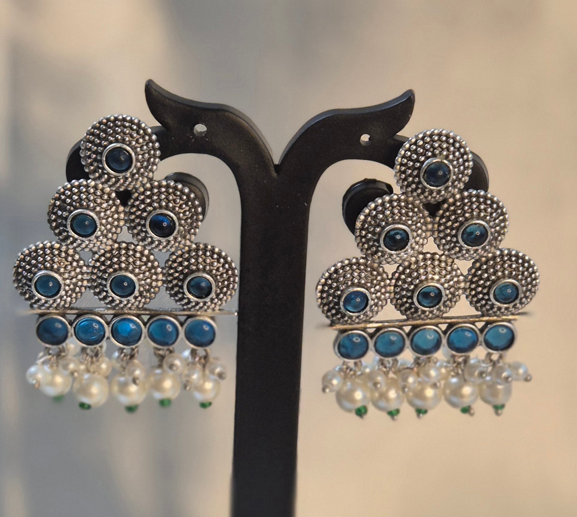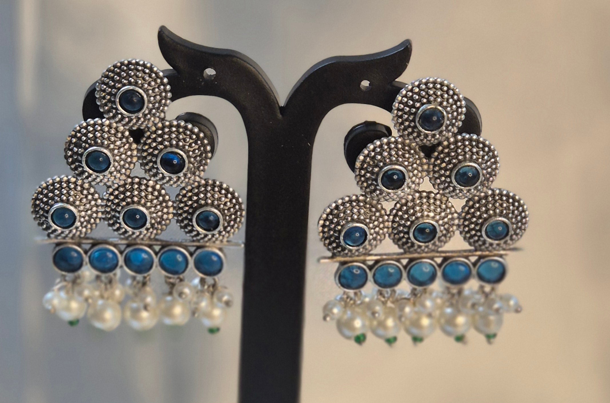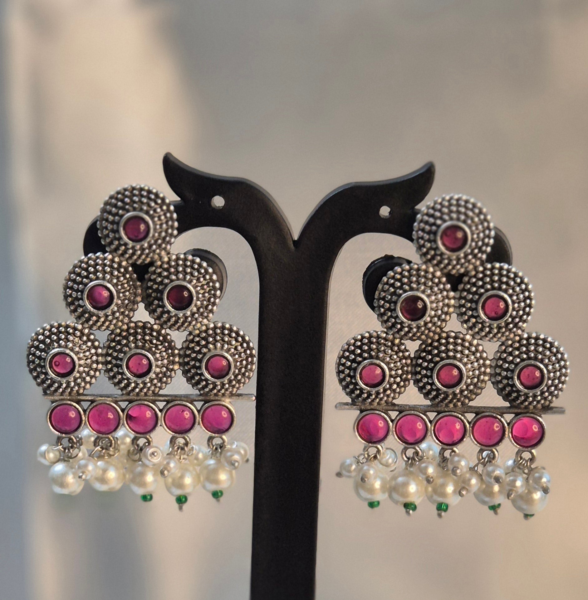 Oxidised Triangle Stud With Pearl Hangings